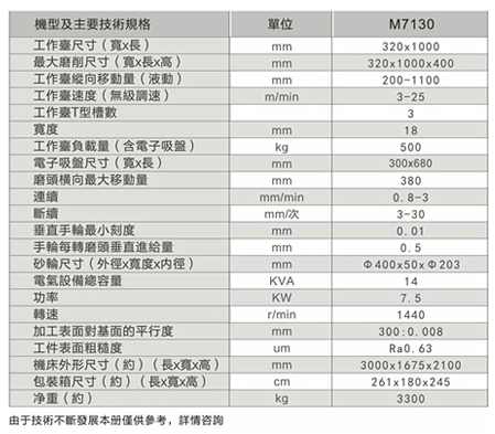 工作精度:加工工件等厚度0.015mm/1000mm;局部0.008mm/300mm